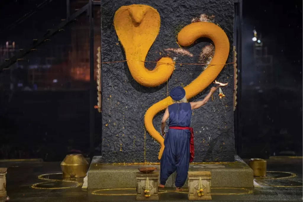 One can experience the Naga Arati ritual at 6:20 AM, 12:20 PM, and 6:20 PM.
