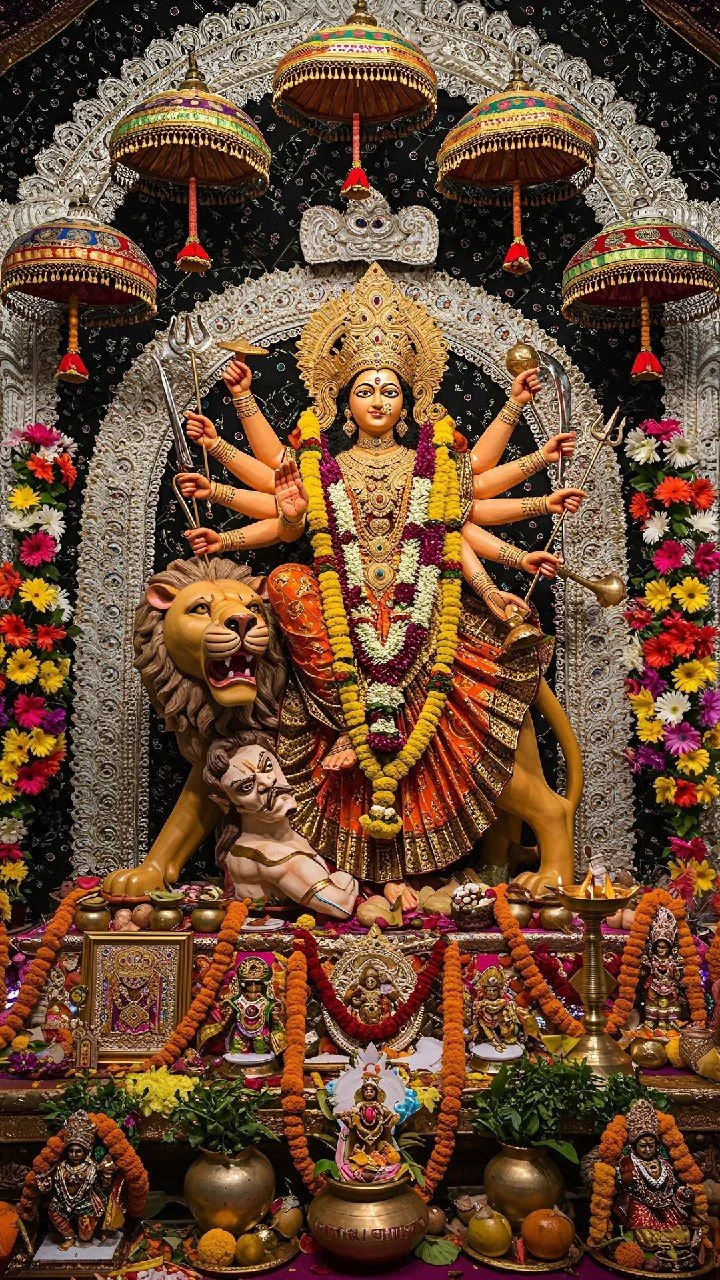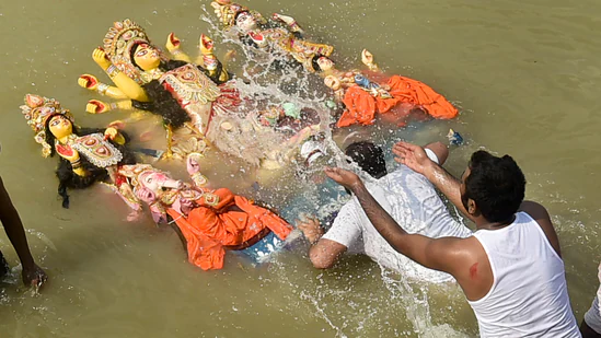In Bengal, Assam, Orissa, and Bihar, Navaratri is celebrated as Durga Puja. Pandals are built at Durga temples, near public places, shrines and community squares, where devotees gather to perform puja and worship Goddess Durga. The main puja takes place on the 7th, 8th and 9th day, and includes the recital of prayers, scriptures, and stories of Durga. People visit temples and pandals. On Vijayadashami, clay statues of Durga Devi are taken in a procession and walked to a river or sea for bidding farewell. Devotees wear red for the occasion, and after the procession, they distribute sweets and gifts.
