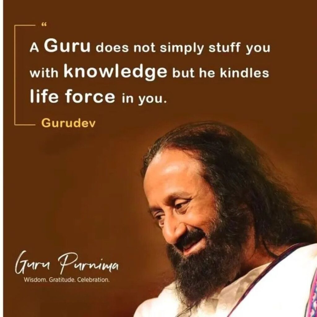 According to Sri Sri, a guru is someone who guides you into wisdom and knowledge and kindles the life force in you. The best way to usher peace into your life is to be close to the guru through sadhana, satsang, reflection and devotion, and that guru is a reflection of your own true nature and a guide who leads you back to your true self. He says that everyone has an element of guru. Knowingly or unknowingly, if you have served someone unconditionally, you have played the role of a guru. Guru, according to Sri Sri is light and wisdom, two factors essential in human life. When there is something that you cannot handle, the guru is your savior. When there is a strong desire in your mind, guru is your guide. A real guru, with his unconditional love, stands by his disciples, always.